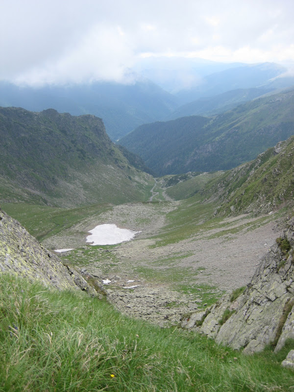 Initial, ideea era sa ne intorcem pe creasta pana la fereastra Zmeilor si sa coboram de acolo la refugiu, unde dadeam intr-un marcaj, si apoi pe Trasfagarasan. Dan a preferat sa coboram direct din Moldoveanu … mai ales ca incepuse sa se aude tunete. 🙂