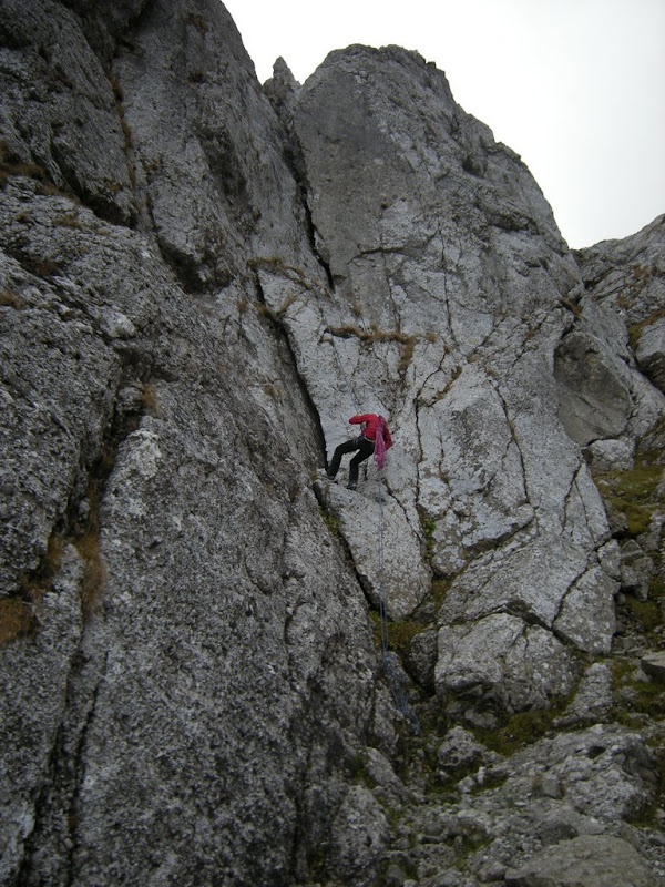 Fac primele doua lungimi dintr-una – plec prima cap: se intra pe o portiune de catarare destul de usoara, si apoi urmeaza un traverseu lung, oblic pe o brana de iarba.