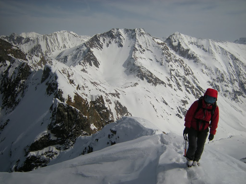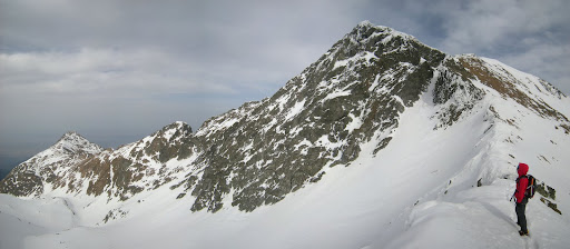 Se vede continuarea crestei Vartopel. 😉 Cornisele nu sunt mari, zapada e in unele locuri buna (mai ales pe parte nordica) iar in unele locuri foarte moale si apoasa. Nu bate vantul, si e placut! 🙂