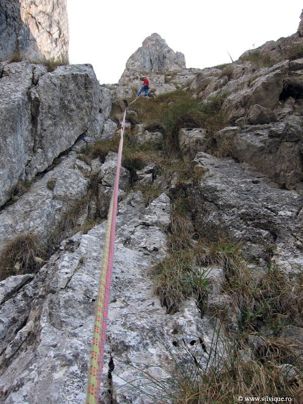 Apoi predomina catarare foarte usoara insa mai exista cateva pasaje de catarare mai atenta. Pe aceasta lungime, fiind foarte slab asigurata, am mai asigurat la tancuri de stanca sau mobile. 🙂