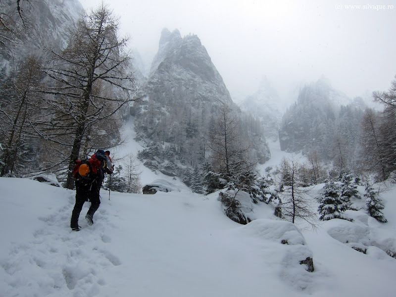 Ninge. Din cand in cand, pe vale se scurg mici avalanse de zapada pulver. E vorba de zapada proaspat ninsa care curge de pe peretii din jur, insa pe unii dintre noi ii cam sperie: