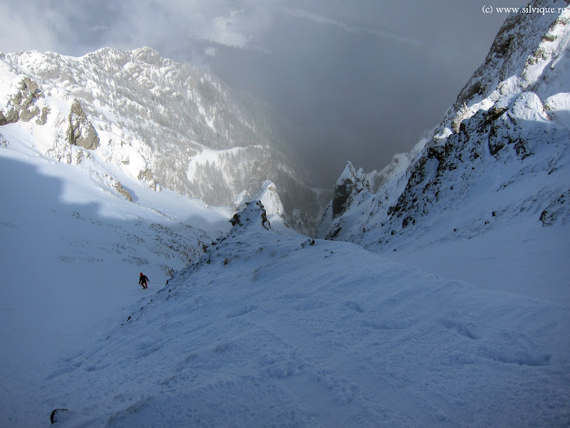 Urca inapoi in creasta si mai traversam, apoi intram pe acea panta pe care mi-o aminteam si incepem coborarea …