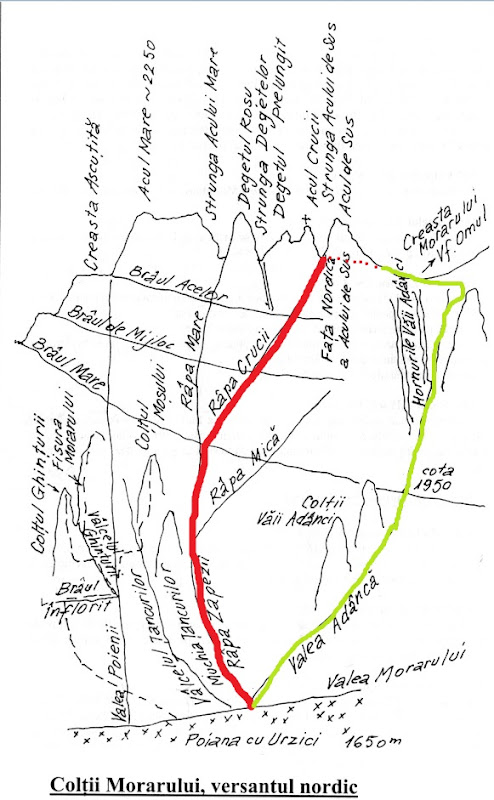 * Duminica : Urcare pe Rapa Crucii (linie rosie) si coborare pe Valea Adanca (linie verde) – vezi topo mai jos! 😉