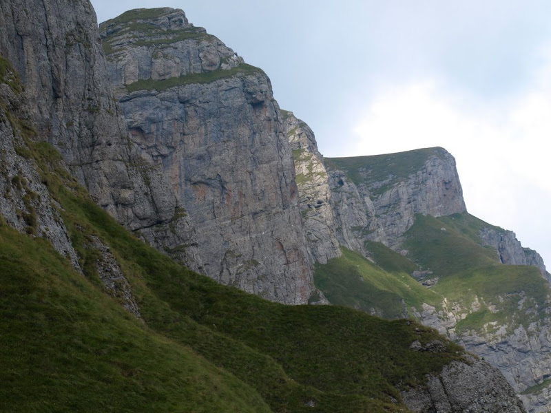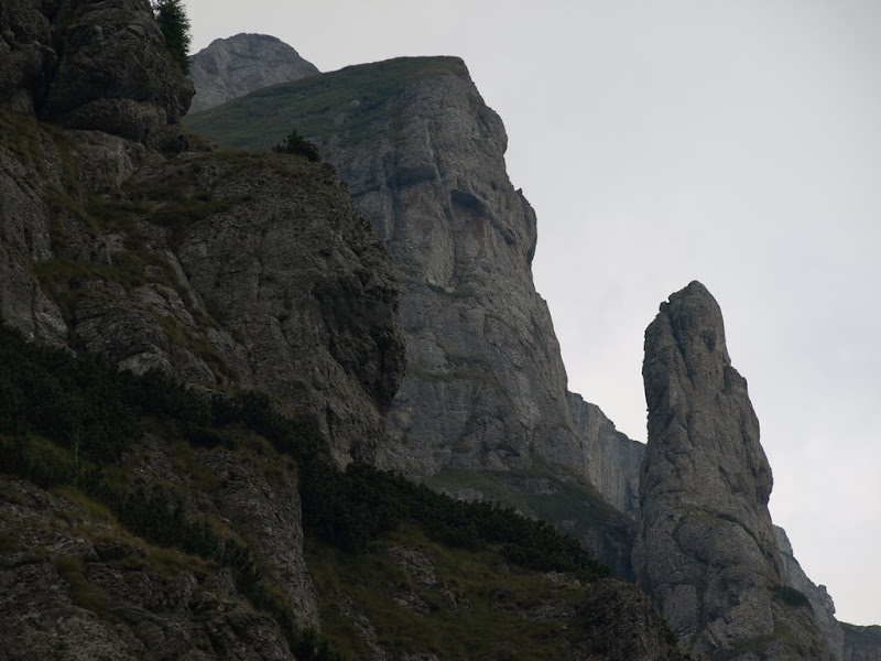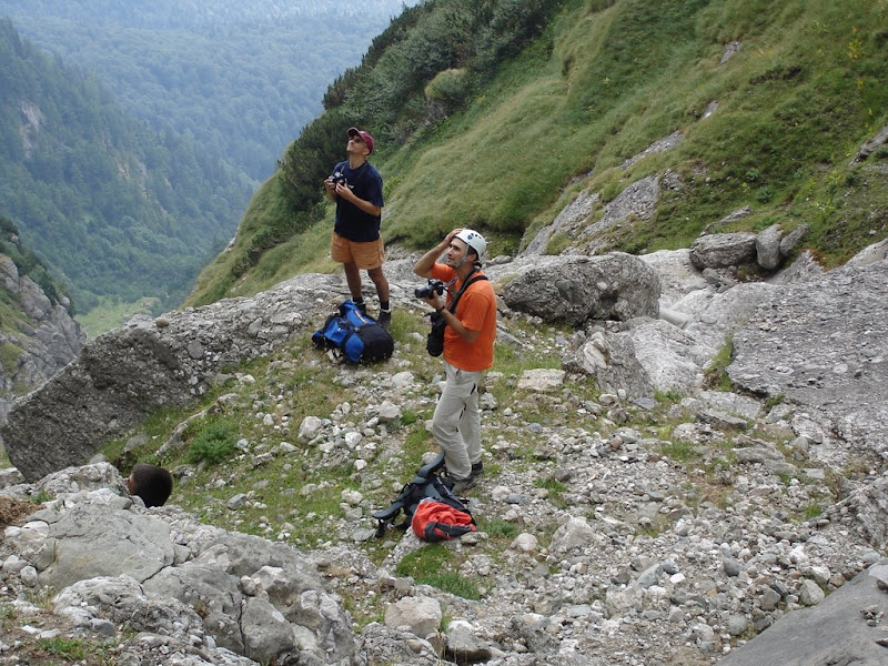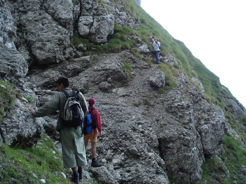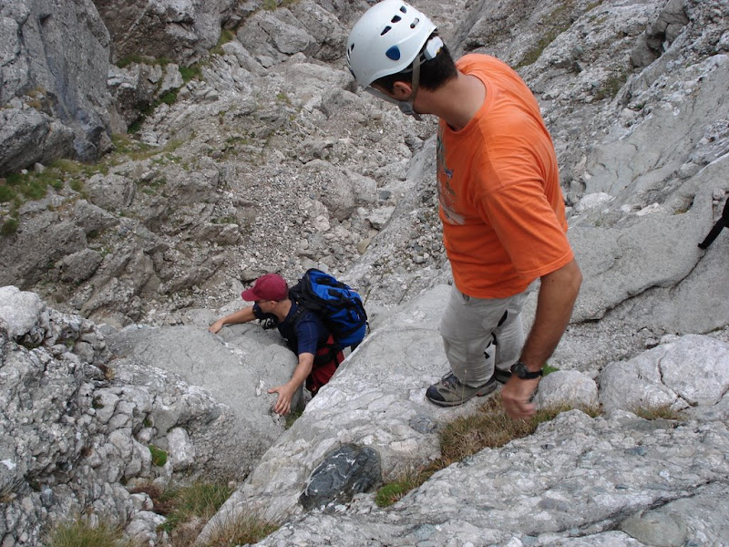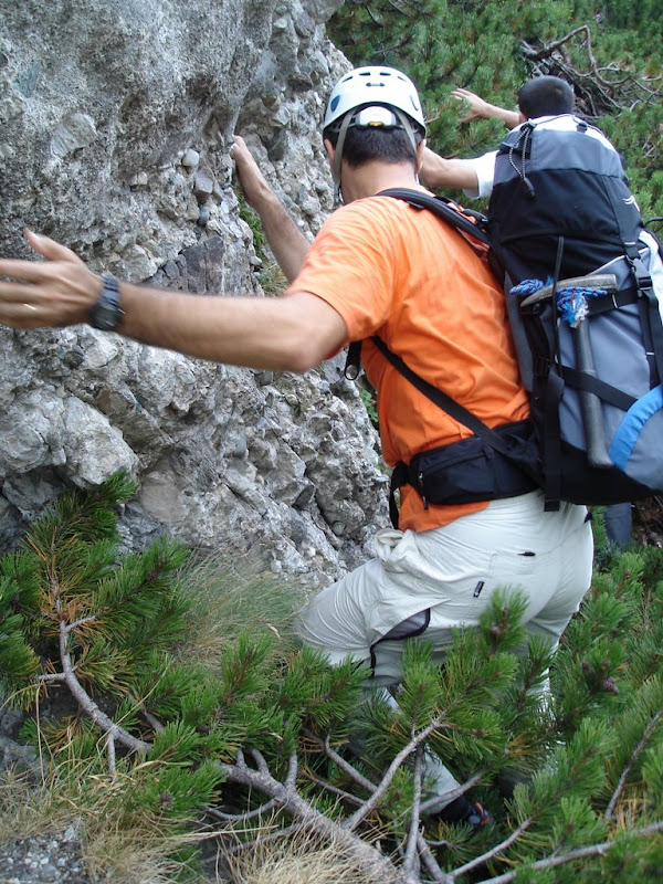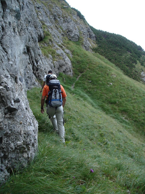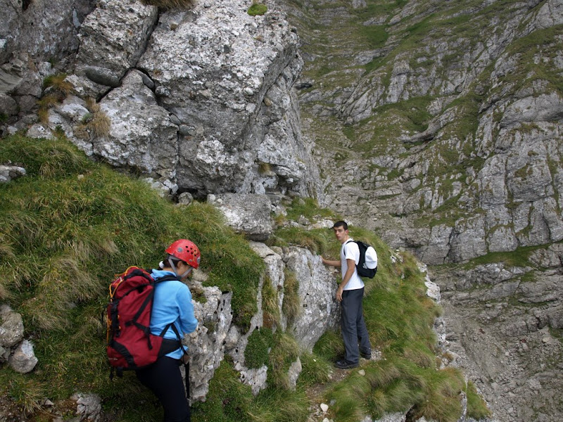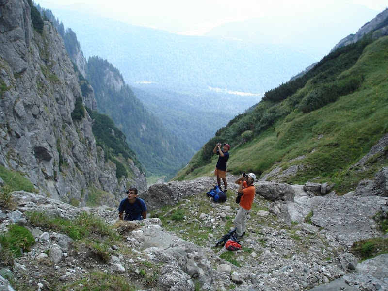 Acum, ca suntem cu burtile pline si cu rucsacii mai usurei, plecam in cautarea intrarii in Brana Mare a Costilei. Ne-am cocotat pe partea stanga sa putem sa distingem poteca catre brana ……. Cristi zicea ca ar fi existat 2 intrari in brana si ca una dintre acestea este marcata cu rosu BMC. Eu il cred!!