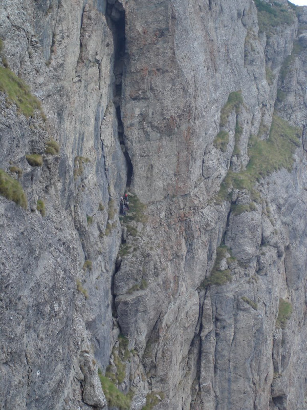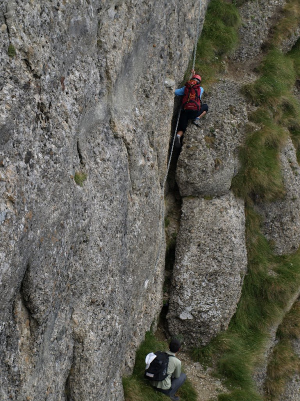 Fisura Rosie cu alpinisti in regrupare. Era pentru prima data in viata mea cand vedeam alpinisti in traseu, in mod real. Ma uitam uimita la ei … mi se parea incredibil de greu dar si interesant ceea ce faceau ei.