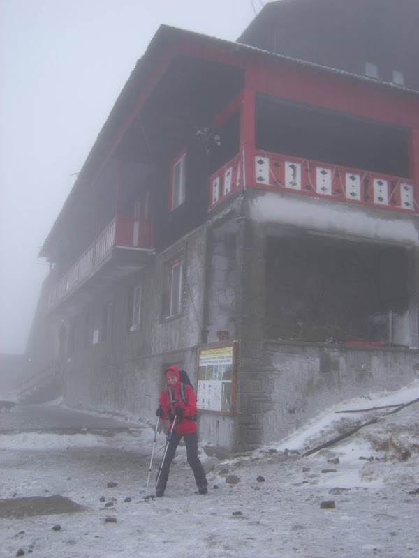 Dimineata ne trezim cu cortul care statea culcat pe noi din cauza vantului care batea din ce in ce mai tare. Afara era ceata, nu se vede nimic in jur – descurajant. Se cam udasera toate … asa ca stangem si intram repede in cabana. Un ceai, un pachet de biscuiti … un cabanier cam antipatic (mie asa mi s-a parut), muzica de colinde …
